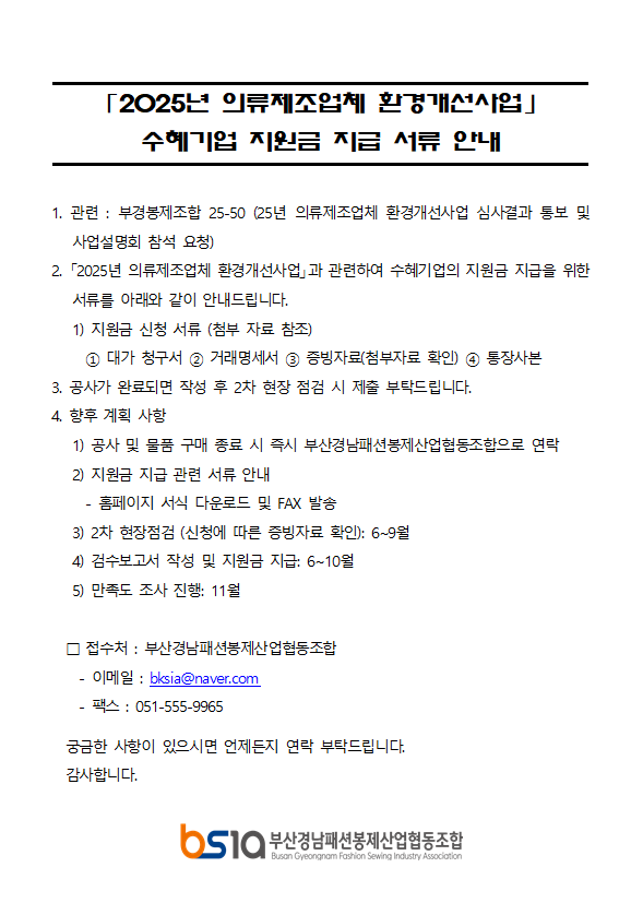 [공지] 「2025년 의류제조업체 환경개선사업」 수혜기업 지원금 지급 서류 안내
